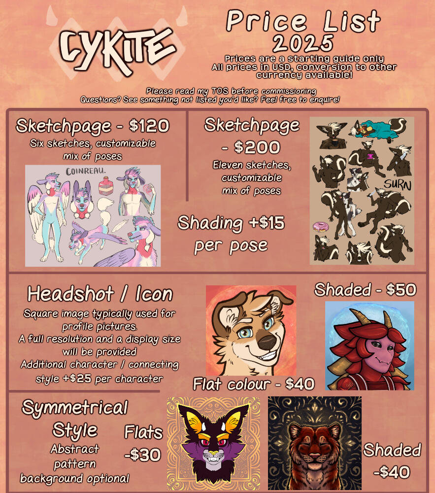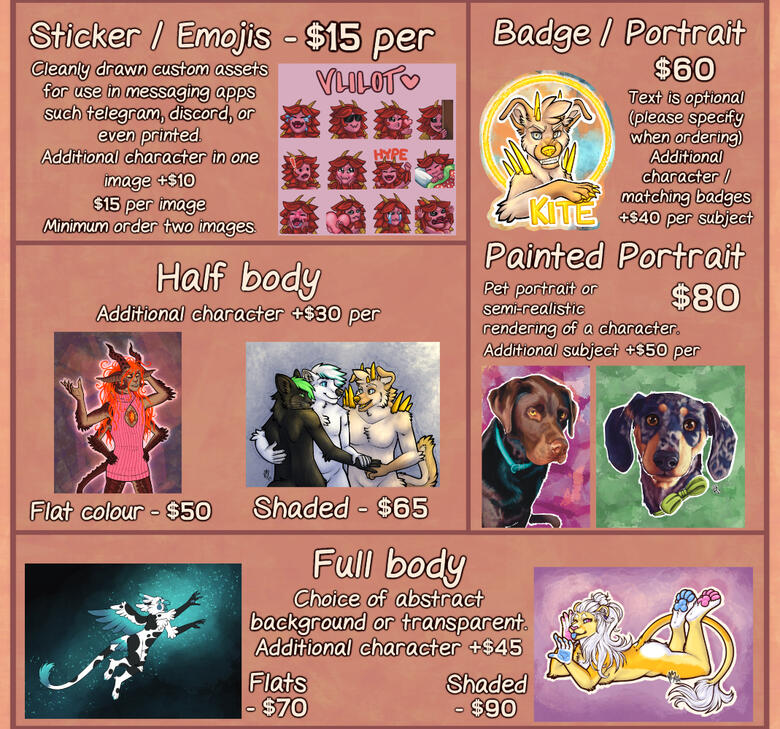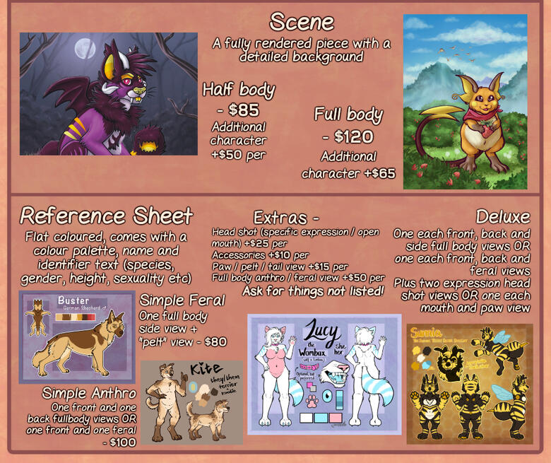 Please refer to my terms of service before ordering - by ordering you agree with these termsAll prices displayed are base starting guides, and are in USD (conversions can be made to pay in AUD or other currencies)Feel free to enquire about anything you'd like that isn't listed here, or if you have any questions not covered by my terms of service or price sheet!Higher quality versions of example images may be found on my archive